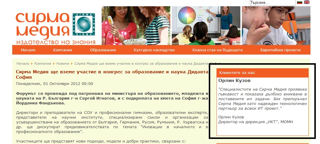 „Сирма Груп Холдинг“ е сред най-големите групи IT компании. Нейните апетити към образователния сектор се реализират чрез „Сирма Медия“. На сайта на тази компания (на илюстрацията)шефът на Дирекция „Информационни и комуникационни технологии“ в МОМН Орлин Кузов фигурира в рубриката „Клиентите за нас“ .